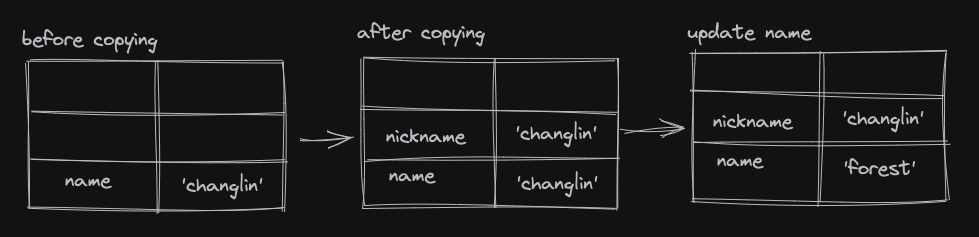 console.log(nickname); // 结果是什么?changlin 还是 forest ?分析一下上面的代码片段,首先声明了一个变量 name 保存的是字符串 'changlin',然后又声明了一个变量 nickname,保存的是 name 的值 'changlin',然后又给变量 name 重新赋值为 forest,此时变量 name 保存的是字符串 forest;在这段代码中,当 nickname = name 执行时,nickname 实际上指向的是存储 'changlin' 的内存位置。后续修改 name 的值为 'forest' 不会影响 nickname,因为它们实际上指向的是不同的内存位置。所以最后打印的结果是 'changlin'。