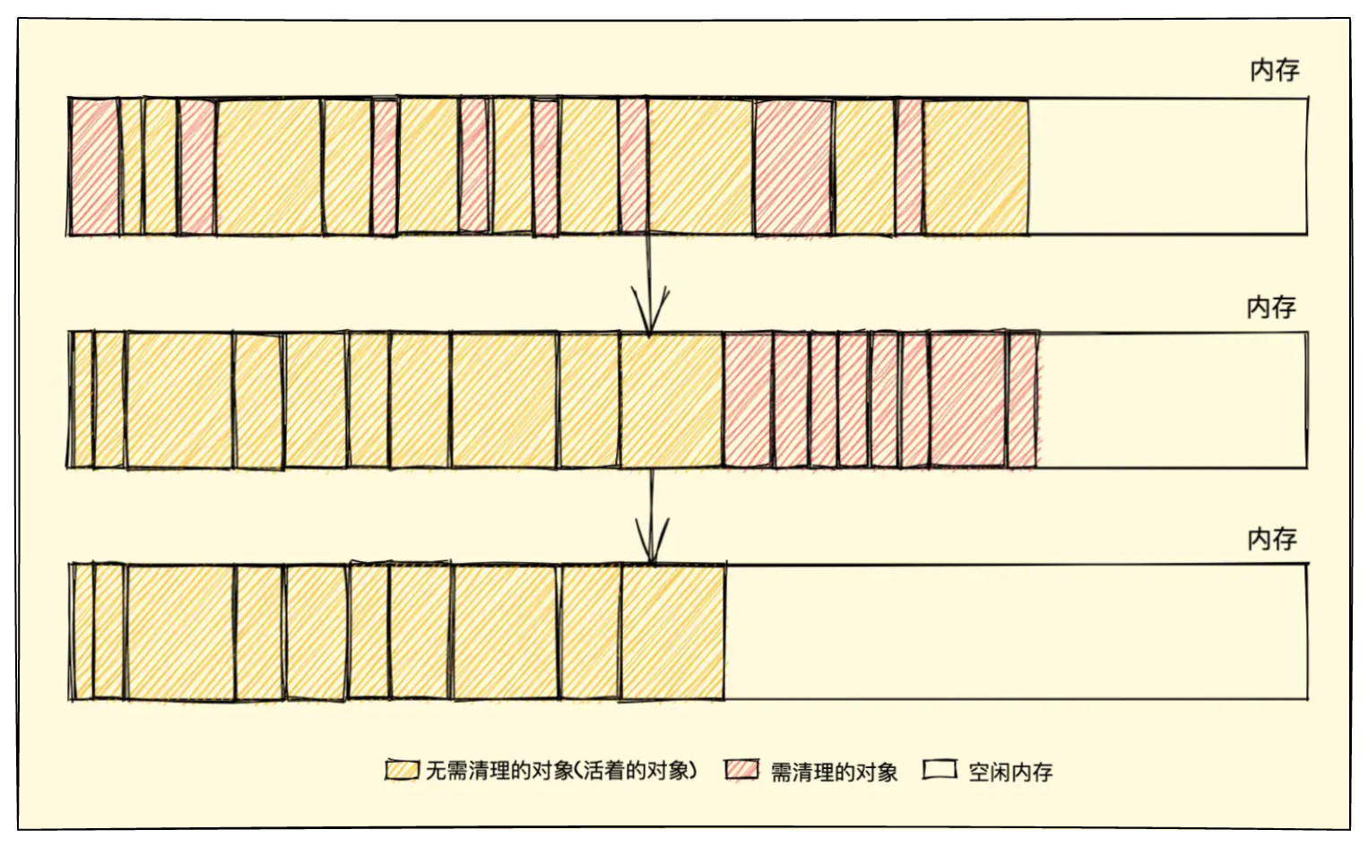 O(n)的操作。 - 内存碎片化:标记清除的过程可能会导致内存中出现很多不连续的空闲小块内存,这就是所谓的内存碎片。当需要分配一个较大的内存块时,可能找不到足够大的连续内存空间,即使空闲的内存总量是充足的。